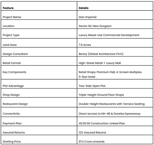 Elan Imperial offers a 40:30:30 payment plan along with a 12% assured return. In a market where commercial real estate in Gurgaon is seeing rising demand but selective supply, that structure reduces risk while construction is underway.